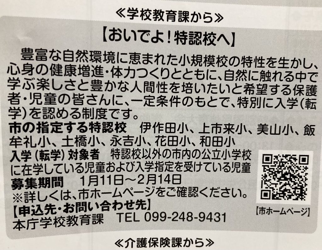 和田小学校へ!特認校生お待ちしてます。2023年10月4日 in その他 昨年度、特認校生での転入がありました。子どもたちも喜び、転入生も楽しい毎日を過ごしているようです。 少ない学校ですが、だからこそのいい面もたくさんあります(^^)迷っている方・見学してみたい方は、ぜひ和田小学校もしくは、和田地区公民館へお電話ください! 学校大好きな子どもたちがお待ちしております笑